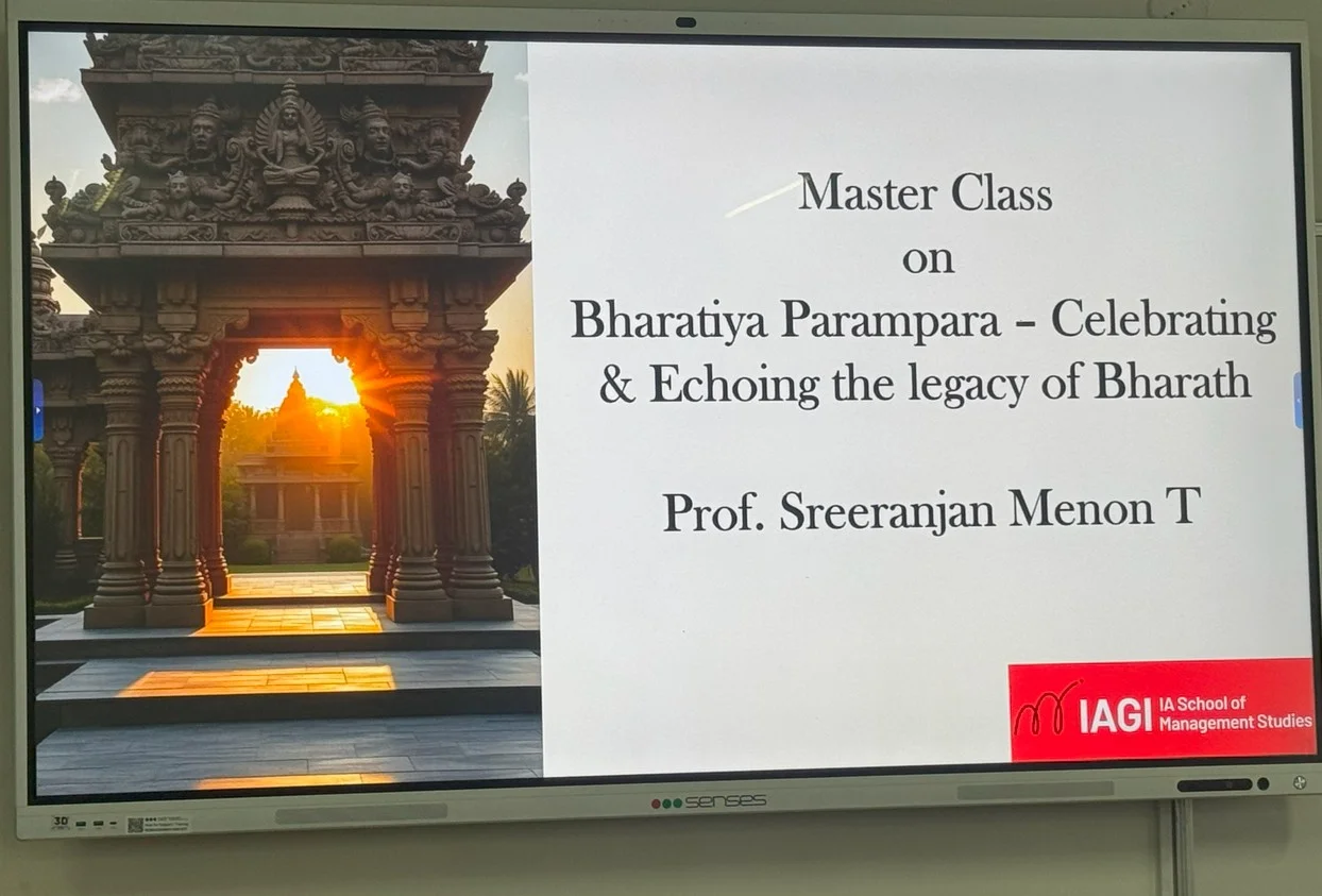 The IA School of Management Studies witnessed an inspiring confluence of heritage and modernity on 7th August 2025, as it hosted the much anticipated master class titled Bharatiya Parampara – Celebrating & Echoing the Legacy of Bharath. The session, part of the IKS (Indian Knowledge System) series, unfolded in Room No. 516, immersing participants in the enduring wisdom and cultural grandeur of India’s ancient traditions.